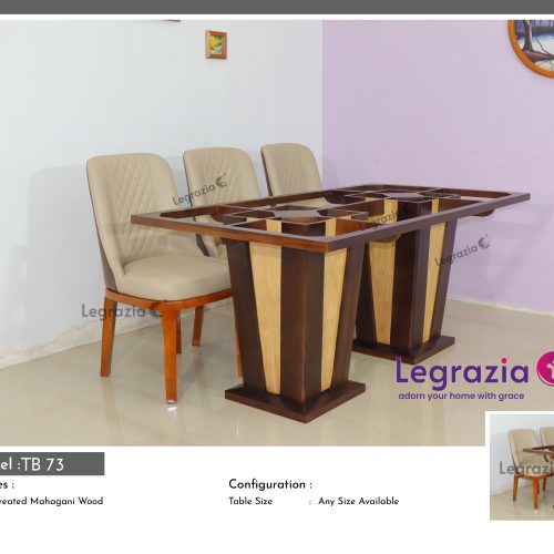The Legrazia TB 68 dining table set features a classic design with a rectangular table and six chairs. The set is constructed from treated Mahagani wood, known for its durability and rich color.